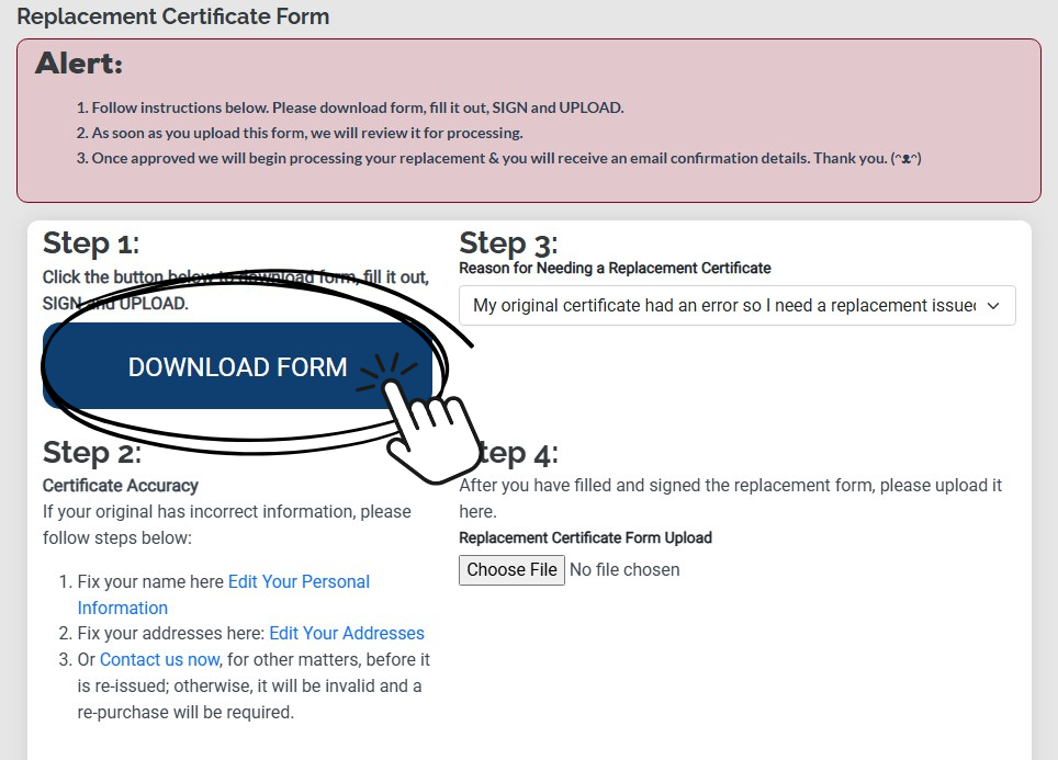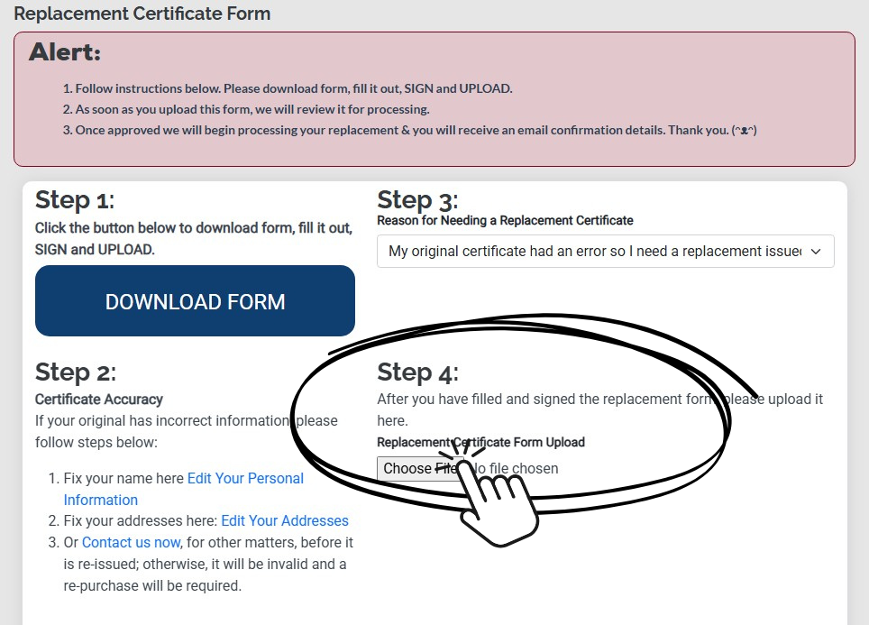 Step 6: Upload the form, then you will receive an email once your new certificate is available