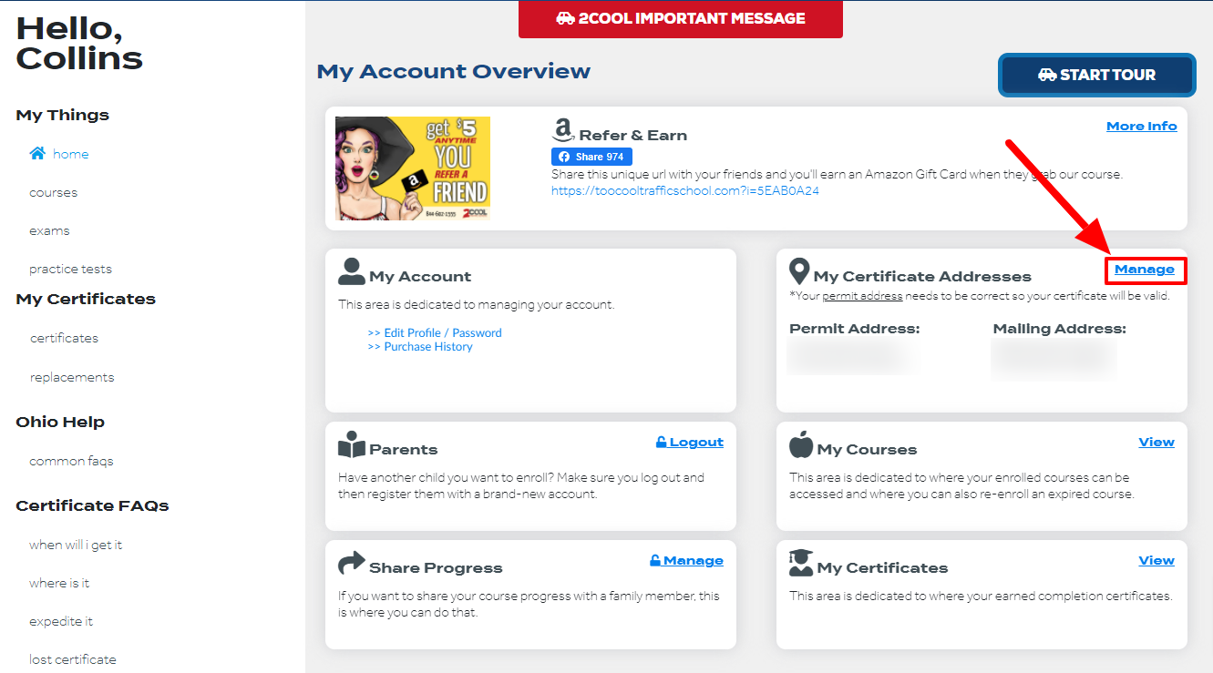 When you sign up with our Partner schools your certificates are shipped directly to your driving school. Because of that you are required to verify that we are sending it somewhere other than your address. So in your account once you get it all set up and you are at your dashboard you will see a “Verify Address” button. Click that and and click through giving us permission to ship it to them and you will come back to the dashboard with a Start button.